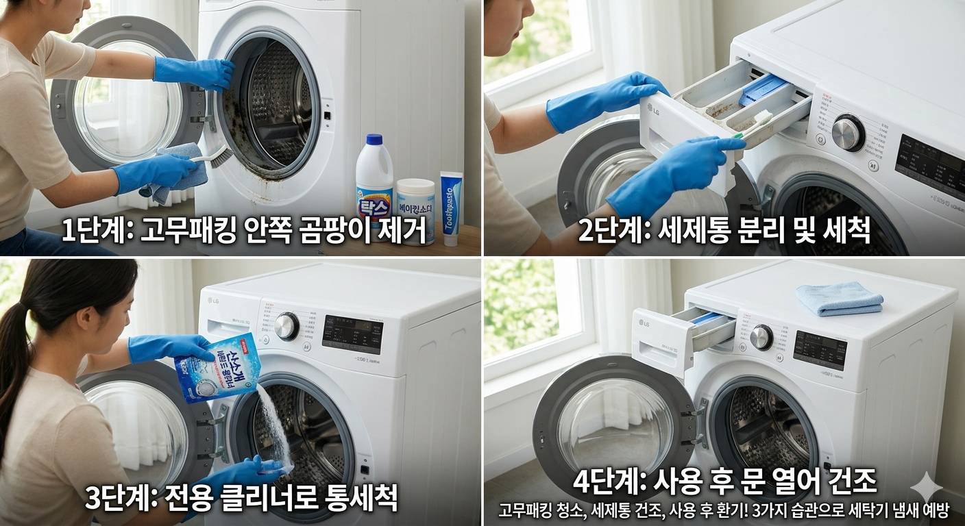 LG전자 공식 고객지원 자료에 따르면, 고무패킹은 월 1회 이상 정기적으로 청소하지 않으면 곰팡이와 이물질로 인한 냄새가 발생할 수 있다고 명시하고 있다. (출처: lge.co.kr)
